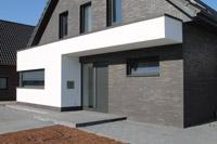 Klinker- Putz- Kombinationsfassade, farbige Fenster (innen und außen
